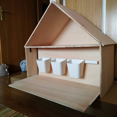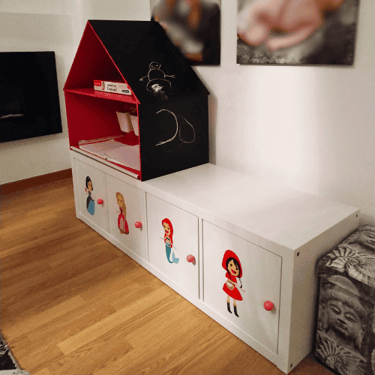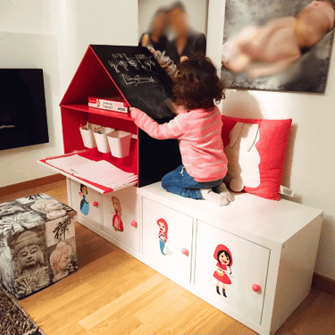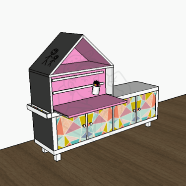Criação de móvel multifacetado com espaço de arrumação para jogos e brinquedos; uma secretária recolhível com calhas para pintar e desenhar; "telhado" pintado com tinta de ardósia preta para desenhar com giz.