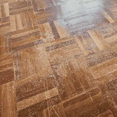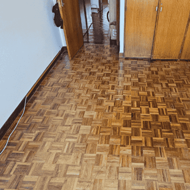 Decapagem, lixagem e envernizamento do chão de um quarto.