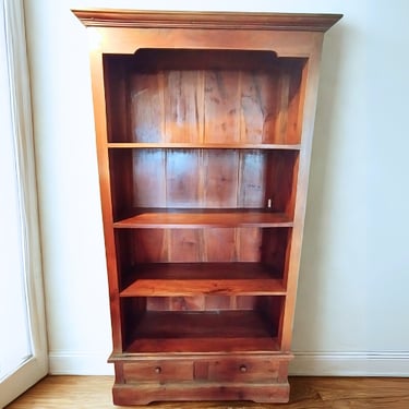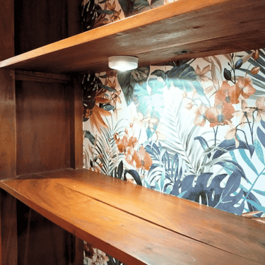 Aplicação de papel de parede no fundo interior de duas estantes de madeira e de iluminação sem fios.