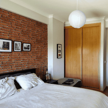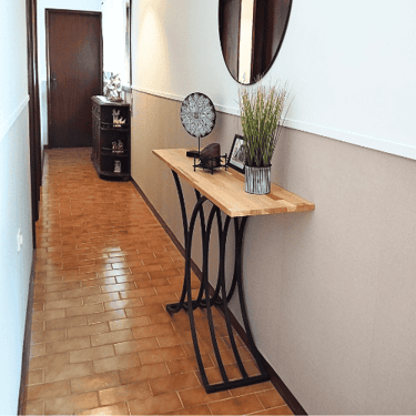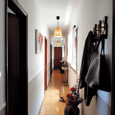 Aplicação de papel de parede, friso de madeira, pintura de paredes, troca e instalação de novas luminárias e reforma de uma mesa de apoio.