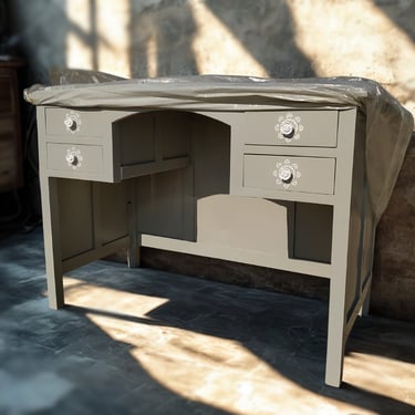 Transformação da secretária através da remoção do espaço de arrumação com portas, lixagem, pequenos arranjos, pintura, stencil de mandalas e novos puxadores.